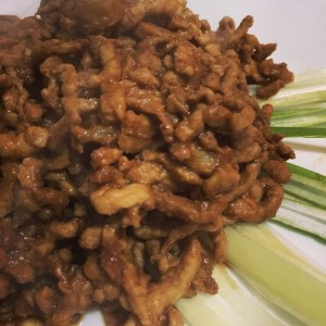 热锅 加入油 油温升高时加入葱段 干红椒榨葱油 后翻炒 闻到香味加入肉丝 大火翻炒 加入适量酱油 甜面酱