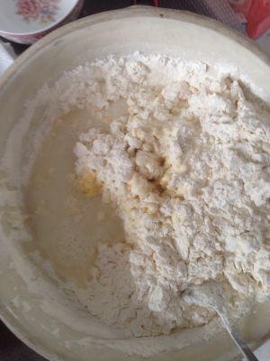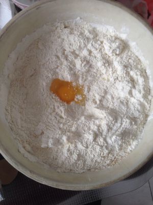 面粉,酵母粉入和面盆中。(酵母粉不能碰水,和面粉融合)再加入一个鸡蛋。