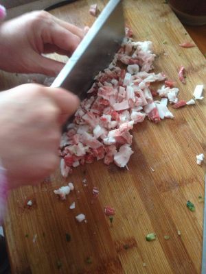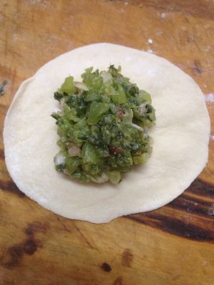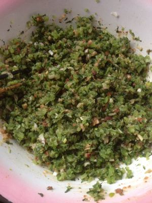 五花肉也当入盆中。拌匀,馅料就算做好了~