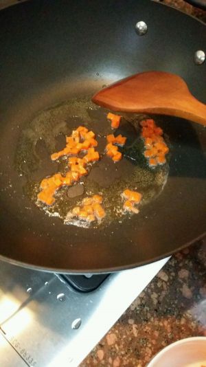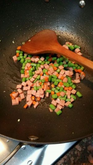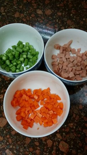 准备所有材料:胡萝卜、吊豆(也可以用各种彩椒,但个人觉得吊豆味道清淡点)、火腿肠全部切成丁备用。