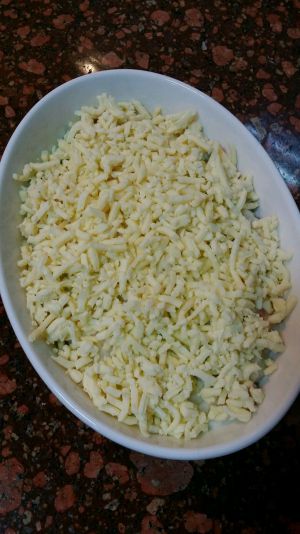 均匀倒铺在容器上,摆上马苏里拉芝士碎。