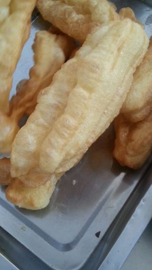 油温升到7-8成热时炸油条。炸的时候,要用筷子翻动油条。油条膨胀,成金黄色就好啦