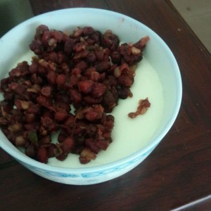 将牛奶倒入碗中放进蒸锅中整至10分钟后,讲牛奶割一个小口,倒出牛奶(留一点牛奶在碗中)放入打泡的蛋白中,用过滤网过滤3次后倒入刚用的碗中,放入蒸锅中蒸15分钟