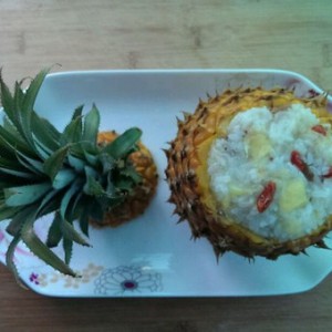 搅拌好以后,把米饭装入挖空的菠萝内。