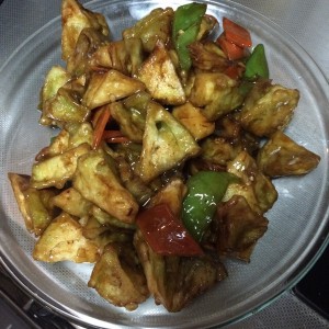 热锅倒油,葱花下锅,加入酱油,盐,味精炒一分钟,加入适量水,倒入辣椒胡萝卜,勾芡,炸脆的茄子倒入锅中使调汁均匀的裹满茄子,出锅。