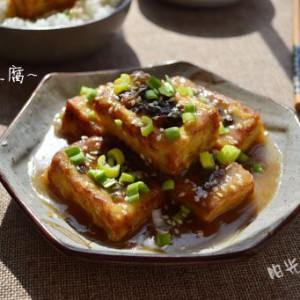 锅里的底油煸香姜片,倒入水,生抽,素蚝油和胡椒粉煮开,放入酿豆腐煮一下。不用煮很久,润一下即可,捞出排盘,剩下的汤汁勾芡后淋在豆腐上,撒点葱花即可。