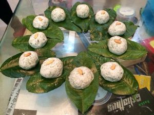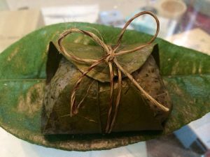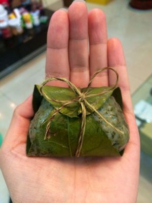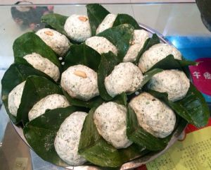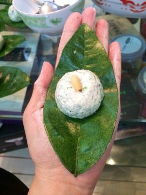 取适量面团包入两种口味的馅儿 包成小青团丸子 放在柚子叶上 为了区分 花生黑芝麻馅儿的放了半颗花生米