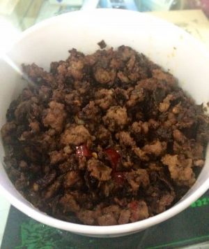 渣渣肉和碎米芽菜加郫县豆瓣炒香待用
