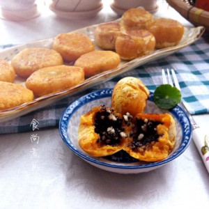 烤盘上铺一层油纸,整齐摆上包好的南瓜饼。