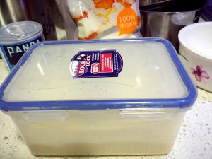 倒入刚刚铺好椰丝的乐扣乐扣,晾凉后,放入冰箱冷藏一夜。