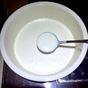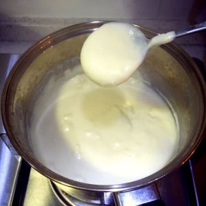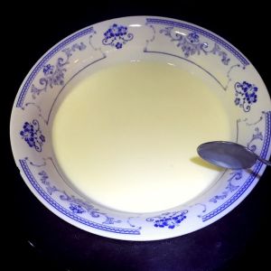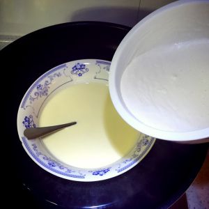 过不了多久,就会发现奶液慢慢变稠,凝固起来。当凝固到挖出一勺奶液,很慢很慢才能滴下时,关火。注意千万不要凝固过头。