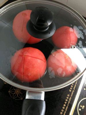 西红柿洗净,上面划一个十字放到开水里,焖两分钟,然后剥皮。