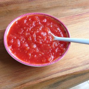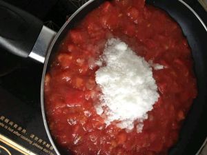 西红柿切丁,放入料理机打碎,和盐、糖一起放入锅中小火来煮。
