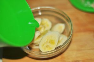 淋上柠檬汁,拌匀后,盖上保鲜膜,放入冰箱冷冻至香蕉变硬。