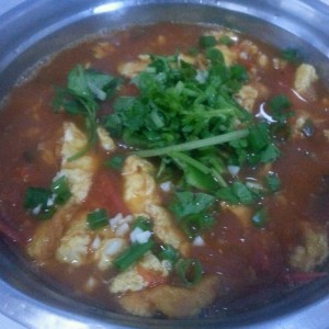放入油,放入葱蒜,爆香后加入西红柿,炒出红汁,加入少许盐,我比较喜欢汤汁多一点泡饭,稍微加了点热水,烧开加上鸡蛋,翻炒几下,加盐糖调味,糖可以随意多少适量