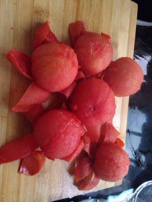 把洗干净的番茄用刀在上面轻轻的划几道口,放进开水里两分钟左右(看到番茄皮会翘起来了),这时捞出来把皮和籽去掉