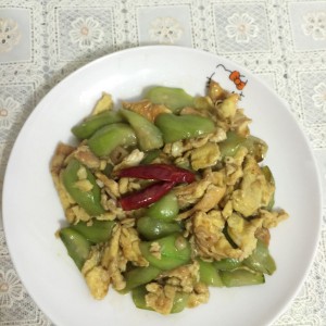 接着不用洗锅直接下油,下辣椒,大蒜爆香后放入丝瓜炒