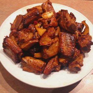 冷锅下一勺油,三勺白砂糖,炒糖色:待锅里糖化,大泡变小泡时表明糖色炒好,倒入排骨,快速翻炒。