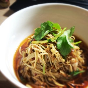 另锅放油爆香蒜头之后放酱油,辣椒酱,陈醋和一起翻炒30秒以后倒进金针菇和事先准备好的香菜碎,搅拌均匀后关火出锅