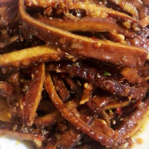 用剩下的油开最小火把蒜末、辣椒粉、花椒粉炒香,放入香干加入盐、味精、生抽、蚝油翻拌匀