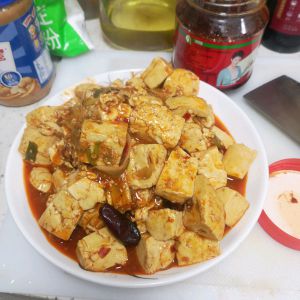 放入豆腐,一勺料酒,一勺生抽,然后加入一碗半水,大火烧开,多炖一会,豆腐软嫩