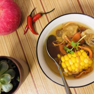 排骨、胡萝卜、玉米一起放入电炖锅里,加两片姜、少量虫草花、枸杞子