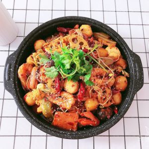 4、然后放入基围虾、所以的丸子类食材,午餐肉迅速地翻炒均匀,加入一点点白酒提香。