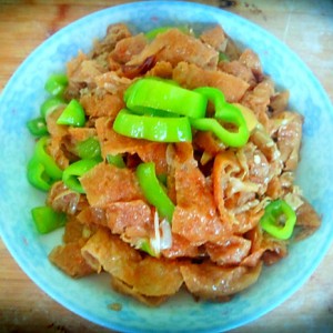 锅中放入少许油,放入葱姜爆香。然后放入面筋翻炒,加入白糖,耗油,翻炒。加入半碗水(吃米饭用的碗大小),烧一小会(锅里剩少许汤)之后加入青椒,盐和一点鲜贝露调味汁。大火翻炒至收汁着火。