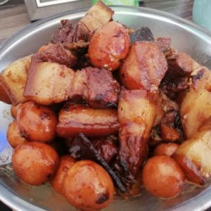 土豆易熟,待红烧肉差不多煮熟时放入土豆鹌鹑蛋