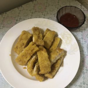 面包糠两面抹匀,简单的按一按,家里没有面包糠的,可以用馒头代替。馒头用手抓成渣。