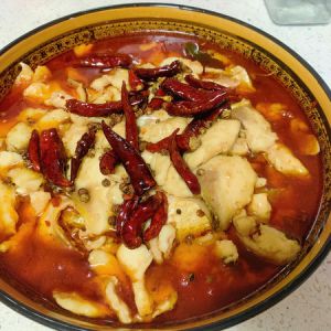 浇再盛好的鱼片上,美味的水煮鱼就做好了