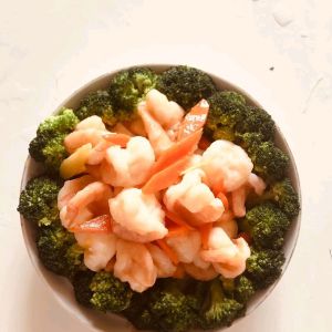 出锅,装入摆好西兰花的盘中。怎么样,是不是很有颜值,有内涵呀!哈哈