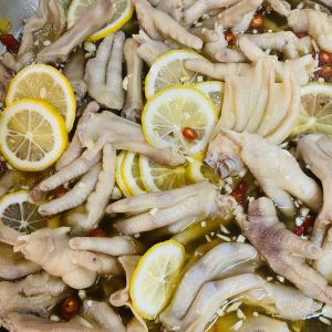 冷水下入鸡爪鸭爪、加入两勺料酒、一颗葱打结、加入两勺盐巴…水烧开后煮八分钟、(不要煮太久、太久不好吃)(拿一块鸡爪出来掐一下肉熟了就可以捞出来了…(马上放到可食用的冰水里面泡…(如果没有冰水就放在流动的净水里面降温、或者也可以用流动的自来水给它降温、之后再用矿泉水流一遍保证鸡爪鸭爪干净)