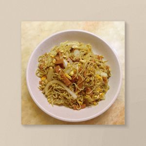 锅里再放油,油热后倒入晾干的面快速翻炒,待面条颜色有点焦黄时倒入鸡蛋、洋葱、火腿一起翻炒,然后下酱油调味,喜欢吃辣的可以放些辣椒酱一起炒