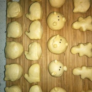 面团长大了两倍,用手指扒开面团有蜂窝就是发酵好了。发酵完成后,面板上铺些面粉揉面,做自己想做的模型,我赶时间,就学的简单形状。