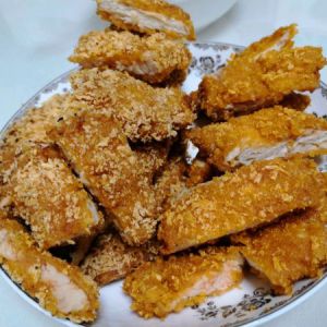 最后出锅装盘,大家可以看到,图片左右鸡排感觉不一样,是给大家对比看的,右边是第一次炸,左边的是剩油第二次炸鸡排,颜色就会差一点。不过吃起了没问题。可以准备番茄酱,孜然辣椒面,老少皆宜。非常喜欢吃,市场买一个鸡胸肉,可以做这样的两盘。吃不完的话,另一盘不要炸,装袋放入冰箱。什么时候想吃拿出来,解冻,再炸,口感一样。