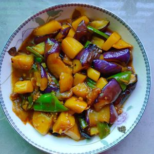 把炸好的茄子,土豆放一起炒两三分钟,再放入青椒炒两分钟。
