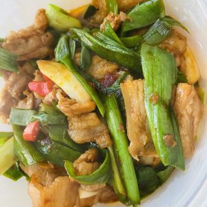 油热下入肉片炒变色(最好焦一些好吃)放入蒜瓣和豆瓣酱煸炒出红油,放入酱油、蚝油、糖加入蒜苗煸炒、出锅前放入小米辣