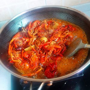 锅里多到一些油油烧特别热,把小龙虾倒锅里炸三分钟,捞出备用