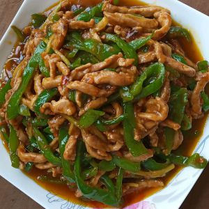 肉丝盖青椒上,倒入适量生抽,和鸡精翻炒均匀