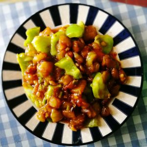 汁收的差不多时倒入青椒翻炒几下就做好了。