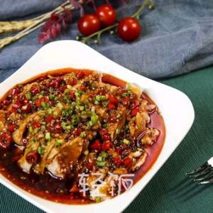 碗中加入适量的冰块,再倒入凉水,将煮好的鸡肉捞出来,浸泡在凉水中,这样可以使鸡肉更加劲道。过凉后的鸡肉切成块状,放进盘中,再把调料汁浇在鸡肉上就做好了。