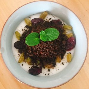 最后撒上饼干碎,再去阳台摘下薄荷芯,插上,造型完美。