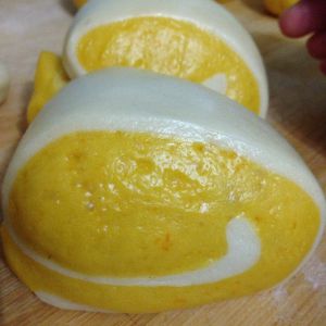 南瓜上锅蒸熟,牛奶微热即可,放到热蒸锅里大概1分钟即可,拿出来不烫手,微温。将酵母倒入,静置3分钟后搅匀。