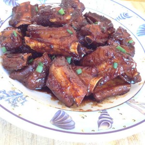锅内放适量的水,接着倒入排骨,加入一汤匙油,一汤匙生抽,两汤匙老抽,两汤匙糖,四汤匙料酒,一颗大料,再加一点点盐!
