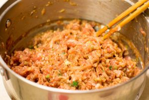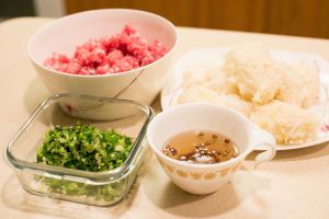 将花椒水倒入肉馅,打一个鸡蛋,放酱油,盐,糖,料酒,姜粉,葱末,香油,少许五香粉调味。按一个方向搅拌,觉得干就加水,一点一点加,最终加一小碗的样子,这样肉馅蒸制完成之后不会收缩成丸子。