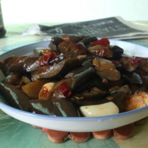 茄子洗净切块,油锅倒入茄子加半勺水盖上盖焖,直到水焖干倒入半勺油放入花椒大蒜翻炒片刻,放入糖盐味精生抽老抽豆瓣酱适量继续翻炒。起锅前放入一点熟油钩芡起锅。最后一步为增加菜的亮度。