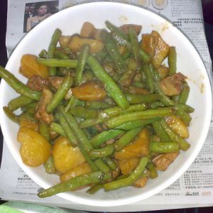 加土豆继续翻炒,加鸡精,等到豆角、土豆都沾过油,颜色明亮后加盐,稍微翻炒下加水,即将没过菜即可;