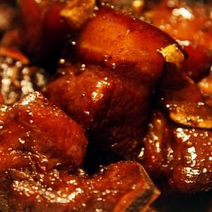 姜切片后和热油加冰糖熬成糖浆,立即转小火,倒入五花肉不停翻炒至上糖色,保持小火状态慢煎肉出油并均匀煎成肉块各面都是焦糖色;
