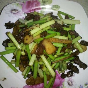 撒入孜然粉、辣椒粉、盐,快速翻炒。可根据个人喜好加入洋葱粒或蒜苔。起锅装盘。